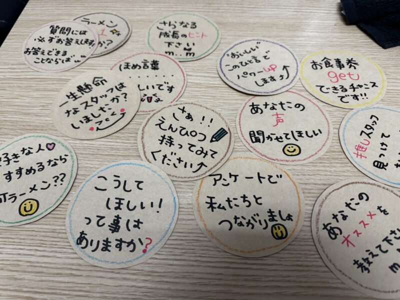 受講してすぐ、「まずは、お客様の声をたくさん集めたいです!」と、アンケートを増やすためのPOPを全テーブル分、手作りしてくれました💓